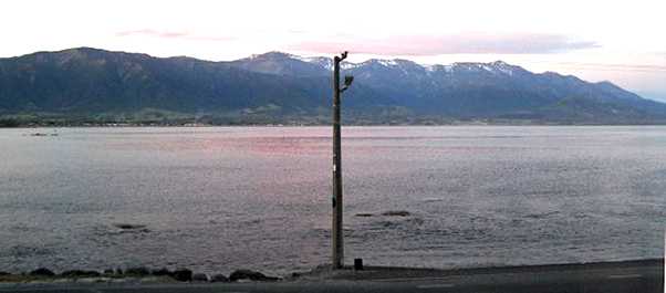 | モーテルのベランダから見るカイコウラ北方の山々。電信柱が邪魔です。