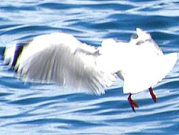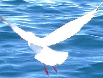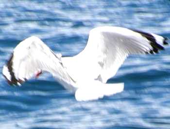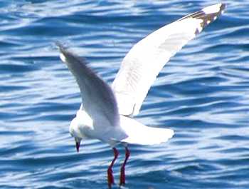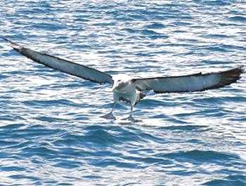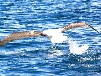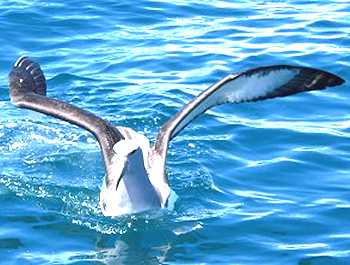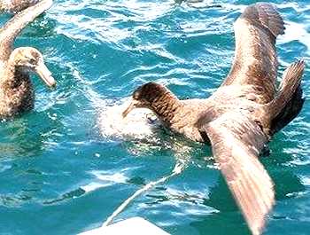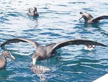 カイコウラ南方沖合でネットに包んだ肉を船尾から垂らすと、早速海鳥がやってきました。 |